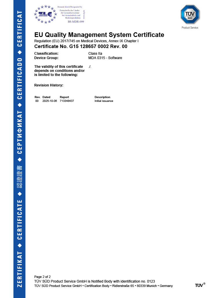 The successful evaluation of our quality management system confirms that our device meets the essential requirements for safety, performance, and risk management under the EU MDR. Our software solution is classified as a Class IIa Medical Device.
