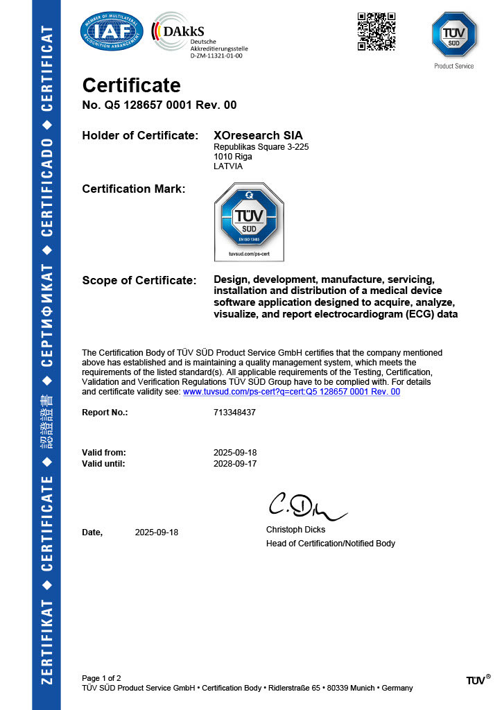 By rigorously meeting these global standards, XOresearch SIA provides the clinical community with the confidence required to integrate advanced ECG analysis tools into their daily practice. This achievement paves the way for continued innovation, allowing us to focus on the next generation of diagnostics, knowing that our platform’s integrity is secured by the highest possible regulatory benchmark.